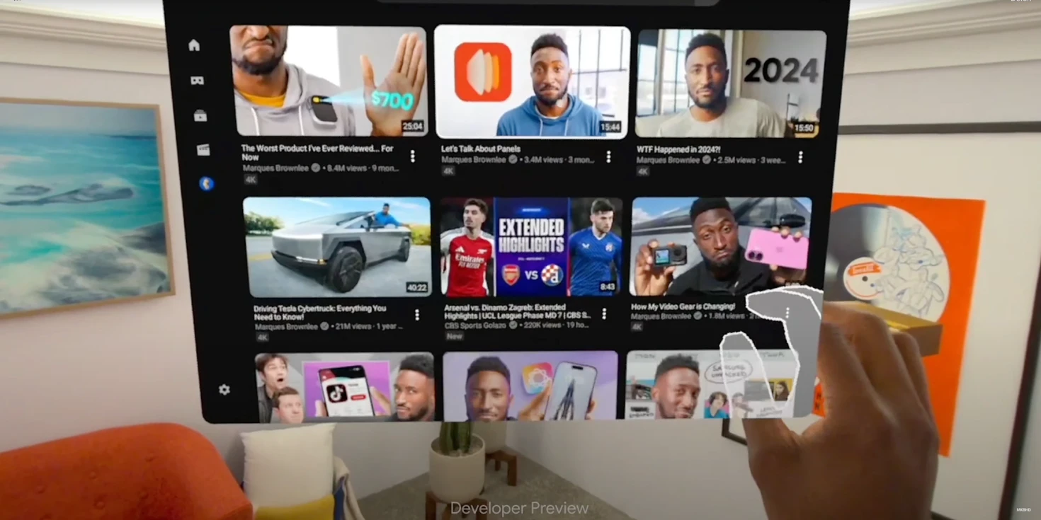 Google had al een screenshot van Android XR gedeeld en die komen overeen met wat MKBHD laat zien. Zo zijn er vensters waarin apps draaien en die kunnen met je handen bediend worden. Er zijn geen controllers al denkt Marques wel dat die er uiteindelijk komen.