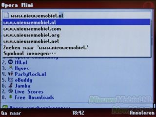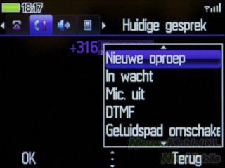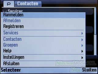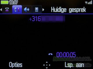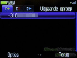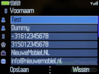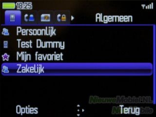Het telefoonboek kan geopend worden met de rechter functietoets. Het telefoonboek heeft wat betreft uiterlijk overeenkomsten met het telefoonboek dat wat we bij toestellen met Symbian aantreffen. In feite heb je de beschikking over vijf telefoonboeken met elk een eigen tabblad. De vijf opties zijn algemeen, meest gebeld, SIM-kaart, toestelgeheugen en groepen. Het doorzoeken van het telefoonboek kan eenvoudig door de beginletters van een naam in te typen.