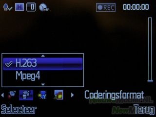 Voor video’s zijn de beschikbare instellingen witbalans, belichting, nachtstand, beeldfrequentie, kwaliteit, opnameduur, opname geluid, coderingsformat, kleur-instelling, mijn video's, opslaglocatie, naar camera en herstel standaardinstellingen.
