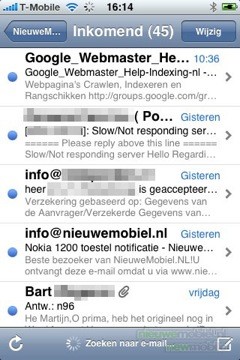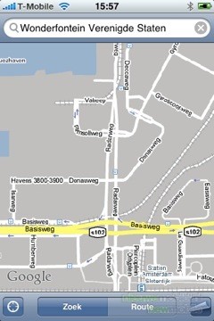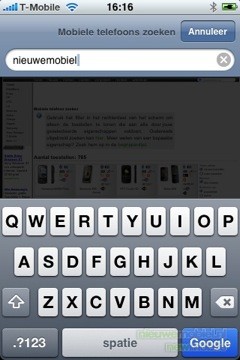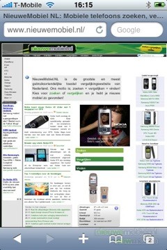 De internet browser bespreken we echter hier, en wat een browser. Het is in feite gewoon de Safari browser die Apple gebruikers zullen herkennen van hun MacBook of Mac maar dan geoptimaliseerd voor het multitouch scherm. Direct onder de adresbalk, waar internetadressen ingevuld kunnen worden, zit een Google balk ingebouwd. Dit zorgt ervoor dat wanneer de internetverbinding traag is de gebruiker een aantal stappen kan overslaan en “effe googlen” inderdaad bij “effe” blijft. Daarnaast kunnen er natuurlijk ook een reeks bookmarks aangemaakt worden waardoor de meest bezochte sites met een paar “touches” tevoorschijn komen. Eenmaal op een site kan er ingezoomd worden op delen tekst door er op te dubbelklikken, of door twee vingers uit elkaar te schuiven op het scherm. Scrollen kan door over het scherm heen te vegen. Dit werkt zo intuïtief dat we opmerken dat dit voor het eerst is dat een telefoon internetten zo makkelijk maakt. Zeer veel telefoons bieden mobiel internet aan als optie, dit is wat ons betreft de één van de weinige waardige. Dat wil zeggen, het bied reële toegevoegde waarde in plaats van “het kan maar ik gebruik het niet”.