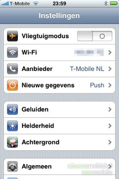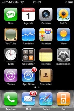 Het menu is direct het stand-by menu en dus altijd zichtbaar. Het is zeer simpel opgezet en het bestaat uit twee elementen waardoor het geheel zeer overzichtelijk is gebleven. Alle onderdelen zijn weergegeven in heldere en grote pictogrammen. Het eerste element is vast, en dus altijd in beeld tijdens gebruik van het menu. Onderaan staan een viertal pictogrammen respectievelijk telefoon, e-mail, internet browser en iPod. Deze kunnen niet aangepast worden. De overige pictogrammen kunnen wel aangepast worden door één van de pictogrammen een aantal seconden aan te blijven raken. Ze kunnen dan op de gewenste locatie en “bladzijde” geplaatst worden. Omdat het mogelijk is met de iPhone applicaties van derden te installeren, waar we onder "Extra’s" nog uitgebreid op ingaan, kan het zijn dat er zoveel pictogrammen zijn dat er geen ruimte meer is op het scherm. Het is de bedoeling dat het gehele toestel zonder stilo te bedienen is en dus moeten pictogrammen groot genoeg blijven. Daarom kan je door een “veeg” over het scherm op de volgende bladzijde van pictogrammen komen. Het aantal bladzijden wordt weergegeven door een overeenkomend aantal puntjes. De bladzijde waar je op dat moment bent, licht in het corresponderende puntje op. Dit klinkt misschien wat vaag maar het is in de praktijk erg intuïtief. Er is alleen bij het toetsenbord mogelijk een klikgeluid in te stellen, in het menu is dat niet mogelijk.