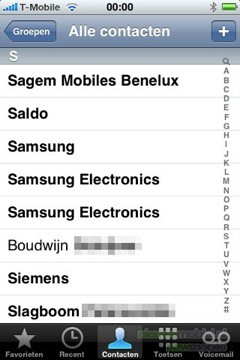 Het unieke multitouch scherm is ook in het telefoonboek weer een factor van belang. De algemene contactenlijst kan op duizelingwekkend tempo doorgebladerd worden door over het scherm te vegen. Daarnaast kan er door op een letter van het alfabet, wat er verticaal naast staat, gedrukt worden direct geskipt worden naar de juiste letter. Bovenaan is er een zoekvenster voor mensen met extreem veel contactpersonen. Erg handig is het kopje favorieten waar je de meest gebelde contactpersonen onder kunt zetten met één druk op de knop.