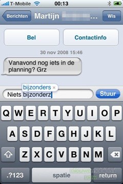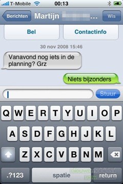 Als een verassing komt misschien dat het toestel niet kan MMS’en. De idee hier achter is dat mobiel e-mail het helemaal moet worden. Vanuit deze theorie is het dus ook niet mogelijk via Bluetooth bestanden naar andere telefoons te sturen. Dit zijn keuzes die Apple voor de gebruiker maakt en inderdaad, dat bevalt ons niets.
