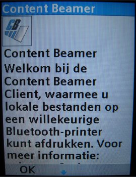 De Content Beamer is eigenlijk een dubbel programma. Het geeft de gebruiker de mogelijkheid tot het printen van data via een Bluetooth verbinding op een printer naar keuze. Het nadeel is dat in het toestel zelf ook de mogelijkheid zit om data te versturen naar een printer. Het zal voor de gebruiker wellicht wat lastig worden om onderscheid te maken tussen beide. Een volledige implementatie van deze applicatie was beter geweest, dat geldt ook voor een gedeelte van de andere programma’s zoals de Docviewer en PDFviewer. Andere merken hebben dit beter voor elkaar.