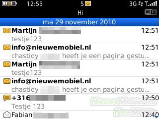 Ook voor e-mail is de Curve 9300 ruim voldoende toegerust. Bij een BlackBerry krijg je de mogelijkheid om een nieuw e-mailadres aan te maken, en je kunt de gegevens van bestaande accounts, zoals Windows Live en Gmail, invoeren. Je kunt maximaal tien ondersteunde persoonlijke of zakelijke e-mailadressen toevoegen die elk een eigen inbox op het toestel krijgen.