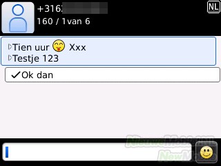 Natuurlijk behoren sms’en en mms’en tot de mogelijkheden op een Curve 9300. Het opstellen van een SMS-bericht is een rechttoe-rechtaan-karweitje. De geadresseerde is snel toegevoegd en vervolgens kan het bericht getypt worden. Een bericht typen met de Curve 9300 gaat vrij gemakkelijk, al is het toetsenbord niet zo comfortabel als op de Bold 9700. Met één hand kan het hele toetsenbord redelijk makkelijk bediend worden.