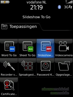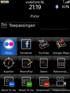 De op de Storm 9500 aanwezige programma’s die we nog niet behandeld hebben leveren nog een aardige waslijst op. Natuurlijk zijn er een agenda en een klok. Verder zijn onder het kopje toepassingen nog een Flickr, Facebook en YouTube applicatie te vinden en Google Maps, BlackBerry Kaarten, memopad, taken, rekenmachine, Word, Sheet en Slideshow To Go, spraakrecorder en password keeper.