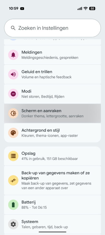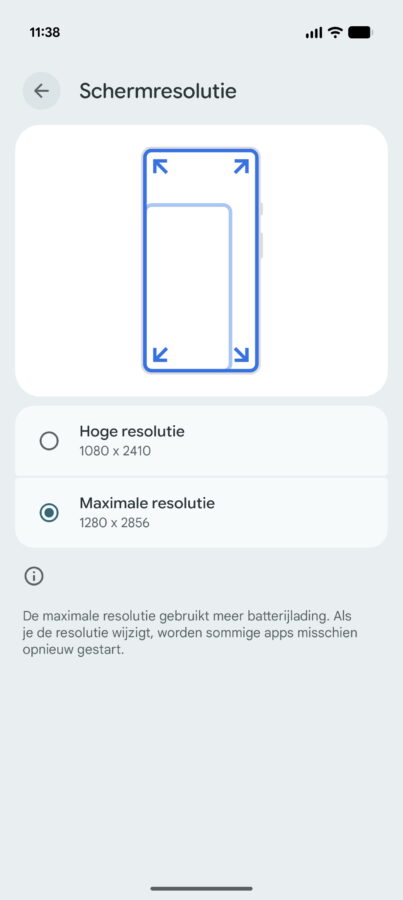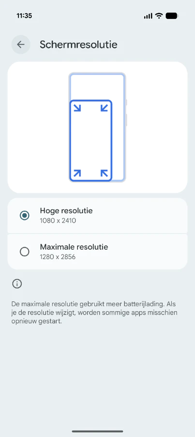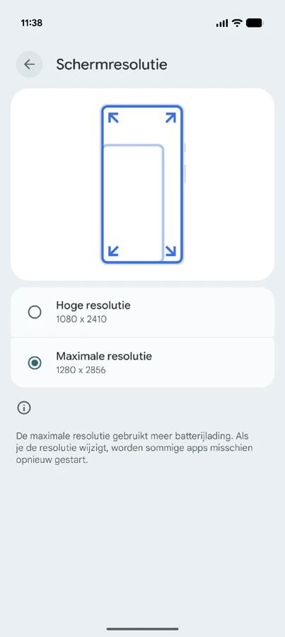 Het paneel oogt prima maar kleuren beginnen wel te vertekenen wanneer je het scherm kantelt. Kleuren ogen wat warm maar dat ligt ook aan Android 16 wat nauwelijks met puur wit werkt. Google levert de Pixel 10 Pro standaard op hoge resolutie (1080 x 2410), wil je meer dan kun je de maximale resolutie (1280 x 2856) kiezen. Die laatste vraagt meer van je batterij en maakt tekst ook iets kleiner. Het zal wel met onze leeftijd te maken hebben maar we vonden het wat te klein, en dus lieten wij hem in deze review op "hoge resolutie". Nergens vonden we het beeld hierdoor niet scherp genoeg.