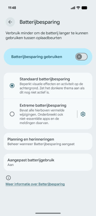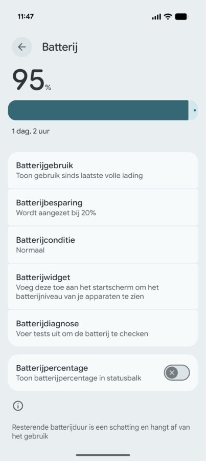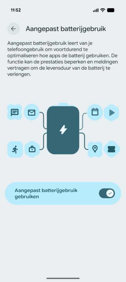 Notificaties komen soms beduidend later binnen dan bij andere telefoons waarop we ons Google-account hebben aangemeld. We snappen dat Google een afweging moet maken tussen het optimaliseren van de batterijduur en de snelheid van notificaties maar hier slaan ze wat ons betreft iets te ver in door. Je kunt onder Instellingen > Batterij > Batterijbesparing > Aangepast batterijgebruik dit uitzetten maar aangezien dit een zelflerende functie is, kan het naar verloop van tijd ook beter worden.