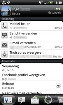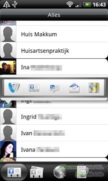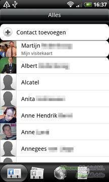 Het telefoonboek van HTC Sense wordt een almaar interactiever geheel dat automatisch synchroniseert met internet. De contactpersonen op de Desire kunnen gekoppeld worden aan Google, Facebook, Flickr, Exchange en eventueel aan de Twitter voor Android applicatie maar die moet je eerst via de Market installeren.