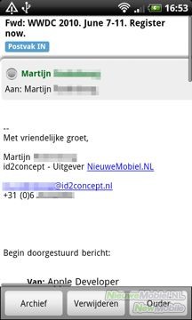 HTML-berichten worden in Gmail beter weergegeven dan in de HTC-applicatie. In de HTC-applicatie zien we ook weer tabbladen terug. Ditmaal voor postvak IN, gesprekken, VIP-groep, ongelezen en bijlagen. Vrijwel alle bijlagen kunnen op het toestel geopend worden. De mappen van webmail worden helaas niet ondersteund.