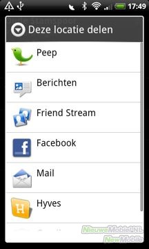 Na het updaten via de Market staat ook op de Desire versie 4.2 van Google Maps. Naast de al bekende opties als je positie bepalen, routeplannen en interessante plekken zoeken kan je nu ook plaatsen delen via e-mail, SMS, Twitter en andere online netwerken en foto’s en recensies voor zoekresultaten bekijken.