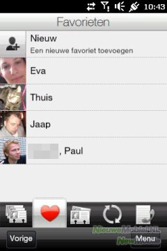 Op het contacten-tabblad op het homescreen kun je je vijftien meest gebruikte contacten toevoegen. Dit tabblad geeft hun namen en foto weer. Via de knop 'meer' kun je je hele adresboek weergeven. Het doorbladeren van je adresboek via de alfabetische selectie aan de linkerkant van het scherm gaat zeer eenvoudig. Terwijl je met je vinger over de letters gaat worden de letters groot weergegeven op het scherm, waardoor je snel bij de juiste beginletter uitkomt. Daarnaast kun je groepen aanmaken en bewerken.