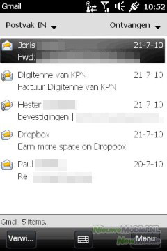 De HD mini ondersteunt push mail, waardoor je berichten onmiddellijk krijgt nadat ze op de mailserver aangekomen zijn. Voor Gmail- en Hotmail-gebruikers is er simpele configuratie-wizard die helpt snel je mailaccount in te stellen. De ondersteuning voor Gmail doet niet onder voor Microsoft's eigen Hotmail, terwijl de HTC toch een Windows-toestel is. Een deel van die ondersteuning is overigens te danken aan Google zelf, dat Gmail compatible heeft gemaakt met Microsoft Exchange.