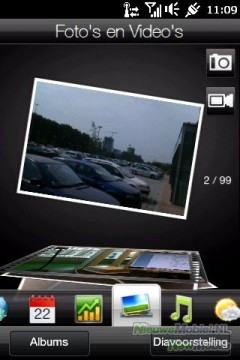 De foto's die je genomen hebt kun je bekijken via het fotoalbum dat op één tabbladen van het homescreen staat. Je kunt daar door de foto's bladeren door ze één voor één weg te vegen. Daarnaast kun je de foto's via de Multimedia-map in het Windows-menu vinden. Foto's kun je delen met je vrienden via MMS, Email of Facebook door op het symbool met twee pijlen te klikken. HTC heeft wel een Twitter-applicatie meegeleverd, maar het is niet mogelijk om je foto's vanuit het album meteen op Twitter te zetten.