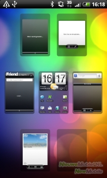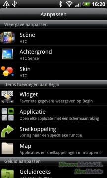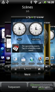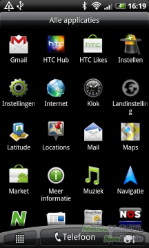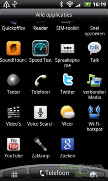 Het principe van de menu’s is zoals we dat van HTC Sense kennen. Er zijn zeven homescreens die allen naar eigen wens zijn in te richten. Onder elk homescreen is de taakbalk met daarin de ‘hoofdmenu’, ‘telefoon’ en ‘aanpassen’ aanwezig. In het hoofdmenu zijn opvallend veel applicaties aanwezig, waarover later meer. Bij zoveel applicaties hadden wij graag de mogelijkheid gehad om een opdeling te maken in categorieën. Helaas is dat echter vooralsnog niet mogelijk. Misschien dat de upgrade van HTC Sense hierin wel voorziet.