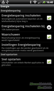 In het instellingenmenu is er een optie tot energiebesparing. Deze schakelt zichzelf in bij minder dan een x percentage (instelbaar) resterende stroom. De instellingen voor wat energiebesparing inhoudt zijn door de gebruiker zelf in te stellen. Zo kun je er voor kiezen dat in de energiebesparingstand de telefoon niet meer naar WiFi-netwerken zoekt, de schermhelderheid vermindert of dat achtergrond animaties worden uitgezet.