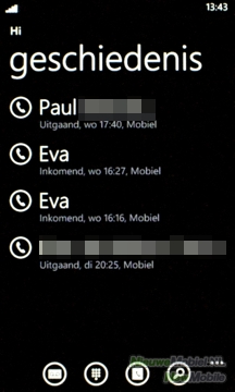 De oproepgeschiedenis komt meteen in beeld als je op de telefoontoets drukt en is niks meer of minder dan een lijst met inkomende en uitgaande oproepen.