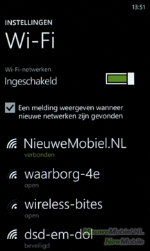 Waar bij sommige Android-toestellen het naar beneden slepen van de statusbalk genoeg is om WiFi aan of uit te kunnen zetten moet bij WP7 helaas het instellingenmenu ingedoken worden. Dit is eigenlijk het enige nadeel, want verder werkt het uitstekend. Verbinding maken met een netwerk gaat soepel en een volgende keer komt de verbinding automatisch tot stand.