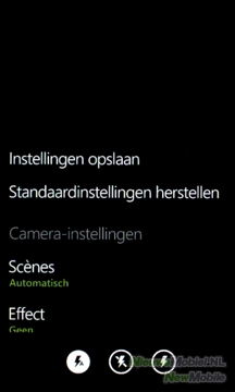 De instellingsmogelijkheden bestaan uit snelkoppelingen voor de flitser en verder zijn de opties onderverdeeld in drie categorieën. Voor de camera zijn dat scènes, effecten, panorama, burstopnames en resolutie. Daaronder staan voor het beeld witbalans, helderheid, contrast, verzadiging, scherpte en ISO. Wat rest zijn de geavanceerde instellingen gezichtsdetectie, meetmodus en trillingaanpassing.