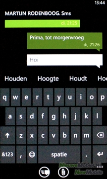 De berichtenapplicatie is weinig spectaculair. Berichten worden per contact gegroepeerd en met tekstballonnen weergegeven. Het virtuele toetsenbord heeft grote toetsen en reageert goed. Dit maakt een bericht typen behoorlijk plezierig. Minder leuk zijn het woordenboek en de spellingscorrectie. Weliswaar verschijnen boven het toetsenbord woordsuggesties maar het automatisch verbeteren gaat nogal lukraak. De ene keer wel en de andere keer niet. Bovendien krijg je hier geen duidelijke melding van. Een woord aan het woordenboek toevoegen gaat omslachtig want daarvoor moet het woord eerst geselecteerd worden en de ene keer kan het wel en de andere keer kan het niet.