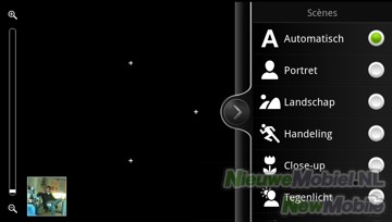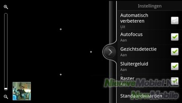De interface van de camera is niet standaard Android, en door HTC verder verbeterd zodat je nu linksonderin het beeld een miniatuur van je laatstgenomen foto ziet, die tegelijk functioneert als snelkoppeling naar het fotoalbum. Verder is links in beeld een balk om in en uit te zoomen. Rechts zien we de overige functietoetsen. Hiermee kan geschakeld worden tussen foto en video en de camera aan voor- of achterzijde van het toestel. De andere twee toetsen zijn voor de flitser en om effecten te selecteren. Bij de instellingen kunnen onder andere nog timer, scenes, belichting, contrast, verzadiging, scherpte, witbalans, ISO, resolutie, geotaggen, autofocus en gezichtsdetectie aangepast worden.