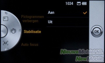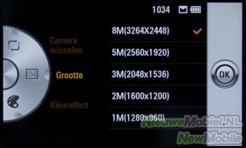 De camera wordt geopend door op de cameraknop of de camera snelkoppeling in het menu te drukken. De interface van de 8.1 megapixel camera is erg overzichtelijk. Links en rechts in de zoeker zijn balken met instellingen. In de balk rechts kun je schakelen tussen de video camera en de fotocamera, Onder deze knop zit een snelkoppeling naar het fotoalbum en boven deze knop zit een knop om terug te gaan naar het menu. Links in de zoeker zit de instellingen knop, de flitserknop, macromodus knop en de helderheid. Wanneer je op de instellingen drukt komt er een wiel te verschijn die je ook wel op normale digitale camera’s vindt. Hier kan je wisselen tussen de primaire en secundaire camera, het aantal megapixels, of je kleureffecten wilt gebruiken (denk aan sepia, negatief etc.), witbalans, timer, fotomodus (normaal of een reeksfoto’s), ISO waarden, kwaliteit, gebruikt geheugen, pictogrammen verbergen, beeldstabilisatie, autofocus, sluitergeluid en een raster.