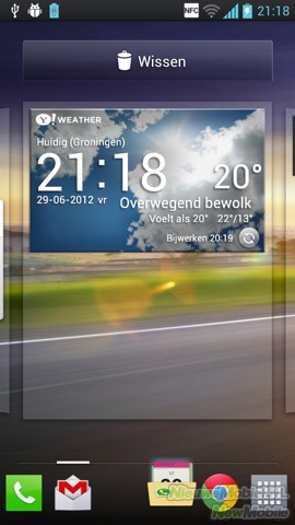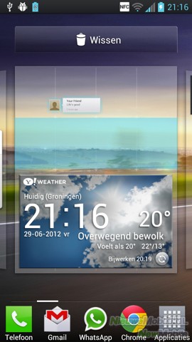 Zelden hebben we een Android-launcher gezien die zo uitgebreid is als op de Optimus 4X. Het lijkt qua functionaliteit erg op het betaalde LauncherPro en ADW. LG noemt het Optimus UI 3.0 en er valt op z'n zachts gezegd nogal wat in te stellen. Dat is mooi want zodoende kun je je 4X helemaal personaliseren, of als je daar geen behoefte aan hebt gewoon laten staan op de standaard instellingen. Het homescreen telt maximaal 7 schermen waarvan je zelf het standaard homescreen kunt instellen. Ieder scherm bevat bovenaan de Google-zoekbalk die je dus niet kunt wissen. Gelukkig neemt hij niet veel ruimte in beslag maar het betekend wel dat je widget maximaal 4 hoog mag zijn.