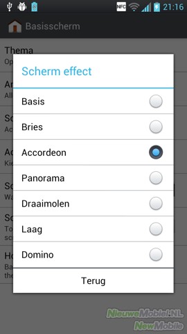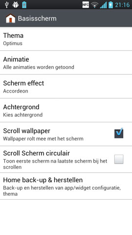 Erg gecharmeerd zijn we van de animatie als je van het ene naar het andere homescreen scrolt. Niet alleen gaat dat erg soepel, het ziet er ook erg fraai uit. Er is daarnaast keuze uit nog meer animaties waaronder een accordeon-effect. Je kunt zelfs instellen dat wanneer je in de linkerhomescreen zit je links naar de uiterst rechter screen scrolt. Wat jij wilt.