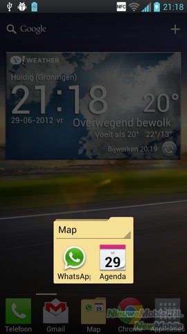 Onderaan in het scherm bevinden zich vier snelkoppelingen met standaard de menuknop. Je kunt hier echter nog tot 5 apps in kwijt en je kunt bovendien folders gebruiken. Een duidelijk voordeel op andere launchers dus. Bovendien kun je zelfs nog thema's instellen.