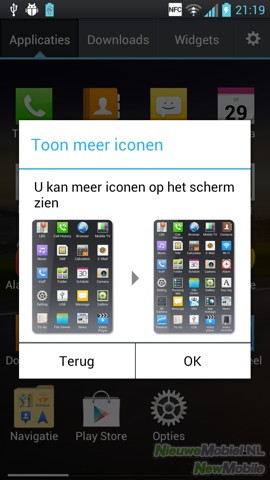 Het menu bestaat uit pagina's met een grid van 4 bij 4 met iconen. Bovenaan zijn tabbladen aanwezig voor apps, downloads en widgets. Ook hier geldt dat je het nodige kunt instellen. Wil je bijvoorbeeld in plaats van 4x4 een grid van 5x5 dan is dat geen probleem. Zo maak je optimaal gebruik van het hoge resolutie scherm, al wordt het er wel wat druk op. De launcher onthoudt op welke pagina je zat als je een app opstart of teruggaat naar het homescreen. Handig, want hierdoor hoe je niet telkens op zoek te gaan naar je pagina met veelgebruikte apps.