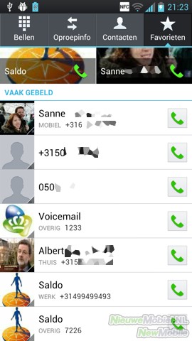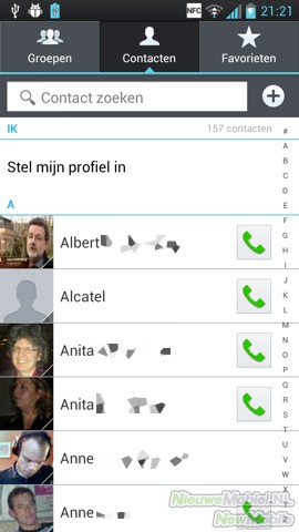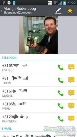 Het contactoverzicht lijkt ook erg op standaard Ice Cream Sandwich al ontbreekt de mogelijkheid om geschiedenis of gekoppelde afbeeldingen van die persoon te bekijken. Dat is wel jammer omdat je hiervoor toch in alle aparte apps moet kijken. Maar over het algemeen is het erg overzichtelijk en redelijk qua functionaliteit. Natuurlijk ontbreekt de mogelijkheid om groepen en favorieten aan te maken niet. Die laatste zit trouwens ook in de bel-app waarbij ook je meest gebelde contacten staan. Die ontbreken dan weer in de telefoonboek-app. Vreemd.