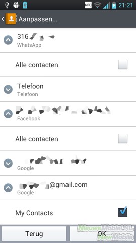 Zoals zojuist besproken kent deze LG een aparte applicatie om te bellen en een aparte applicatie om je contacten in te bekijken. Vreemd genoeg kun je contacten ook bekijken vanuit de bel-app maar die is qua functionaliteit toch net iets anders. Dit kan wat verwarrend overkomen. Zo is het telefoonboek vele malen uitgebreider, met name qua instellingen. Van gekoppelde accounts kun je bijvoorbeeld aangeven of die contacten ook weergegeven moeten worden. Helaas mist een optie om alleen contacten weer te geven met een gekoppeld telefoonnummer. Beschikt dat contact wel over een telefoonnummer dan verschijnt achter de naam een telefoon-icoontje om direct een gesprek te beginnen.
