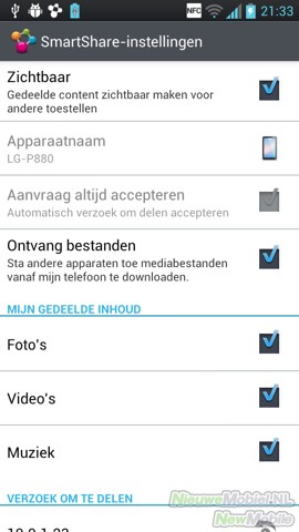 Naast de gebruikelijke WiFi en Bluetooth willen we hier echter een andere mogelijkheid bespreken; SmartShare. Zoals Samsung-telefoons goed met Samsung TV's overweg kunnen, kunnen LG-telefoons dat met LG Televisies. Deze techniek maakt gebruik van DLNA en indien je TV daar ook over beschikt kun je content vanaf je telefoon draadloos afspelen op het grootste scherm in je huis; de TV.