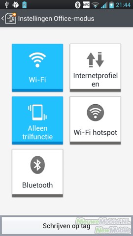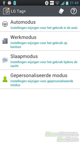 In een zoektocht naar een nuttige functie voor NFC heeft LG voor de Optimus 4X LG Tag+ geschreven. De app lijkt qua werking op de Smart Tags van Sony. Je kunt dus acties uitvoeren met een NFC tag. LG levert standaard twee NFC tags bij je Optimus 4X. LG heeft er een sticker van gemaakt. Bij de onze werd een 'Office mode' en een 'Car mode Tag' meegeleverd. Plak de laatste in je auto en activeer de navigatie en zet bluetooth aan zodra je de Optimus tegen de sticker houdt.