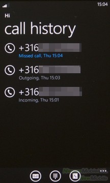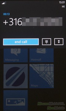 Door in het hoofdmenu op de tegel met het telefoonicoontje te drukken komen we in een lijst met gevoerde gesprekken. Onderaan dit scherm zijn keuzeknoppen te zien die leiden naar de voicemail, numerieke toetsen en het telefoonboek. Tijdens het bellen zijn er verschillende mogelijkheden, naast een knop om het gesprek af te sluiten is er een knop om de numerieke toetsen op te roepen en een knop die een menu uit laat schuiven, met nog meer opties tijdens het bellen. In dit menu staan de opties speaker, mute, hold en gesprek toevoegen.