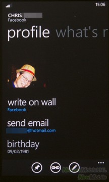 De opties van het telefoonboek hangen af van aan welke accounts het toestel gekoppeld is, zo is er de optie om een bericht op Facebook of via e-mail te versturen, websites van het contact te bekijken of een persoonlijke ringtone toe te voegen. Naast de contactlijst heeft het telefoonboek nog een optie. Als we van rechts naar links over het scherm vegen komen we in een lijst met statusupdates van contacten uit de toegevoegde accounts.