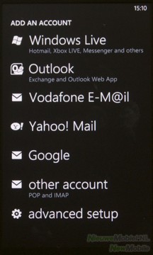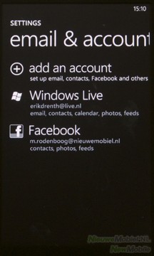 Om te e-mailen geeft Windows Phone 7 de mogelijkheid om het de Optimus 7 te verbinden met verschillende e-mailservices. We kunnen kiezen uit Google, Windows Live, Outlook, Yahoo, POP en IMAP, alle gekoppelde accounts worden in het startscherm als losse tegels weergegeven. Een gezamenlijke samengevoegde inbox is helaas niet mogelijk. Als er meerdere accounts toegevoegd zijn, is het dus veel werk om alles bij te houden.