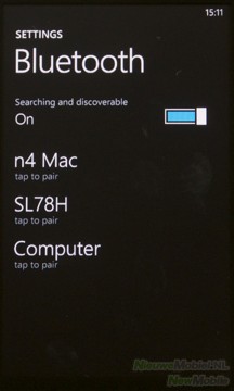 De Optimus 7 is via Bluetooth met andere apparaten te verbinden, helaas worden apparaten wel gevonden maar is het ons nog niet gelukt om bestanden te versturen. De Bluetooth-optie is in het menu aan en uit te zetten.