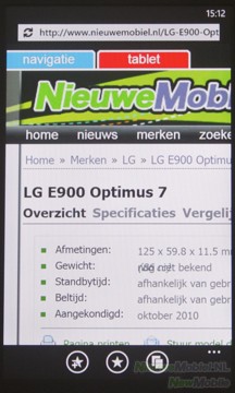 Natuurlijk beschikt Windows Phone 7 over de mobiele versie van Internet Explorer. De browser werkt snel en effectief en alle websites worden goed geladen. Flash wordt helaas niet ondersteund en dus is ook YouTube in eerste instantie niet te gebruiken. Gelukkig is hier een app voor te downloaden waardoor het bekijken van filmpjes wel mogelijk is, maar waarom deze dan niet standaard geïnstalleerd is blijft voor ons onduidelijk. Onderin de browser zijn knoppen te vinden voor het openen van tabbladen en het toevoegen van favorieten, ook is er een menu te openen waarin je pagina’s kan zoeken, delen, op het startscherm kan plaatsen en naar de instellingen kan gaan.