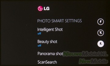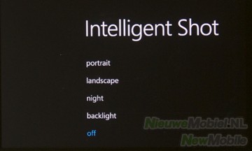 Het menu geeft de keuze uit de volgende opties: intelligent shot voor gebruik tijdens verschillende omstandigheden, beauty shot, panorama shot, instellen van helderheid en witbalans, kleureffecten, kwaliteit en het activeren van de anti-shake functie.