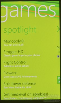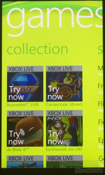 Achter de Games-tegel op het startscherm schuilt de connectie met Xbox Live, het is de bedoeling dat over een tijdje spellen die op de Xbox begonnen zijn, via de telefoon verder gespeeld kunnen worden. Verder zijn hier wat games voor de telefoon te downloaden, maar deze kosten allemaal geld.