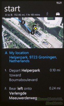 Dit programma werkt zoals we dit van de gemiddelde smartphone gewend zijn: we kunnen onze eigen locatie bepalen, een locatie zoeken en een route tussen twee verschillende locaties opvragen. Wel is er de keuze tussen een reis met de auto of te voet.