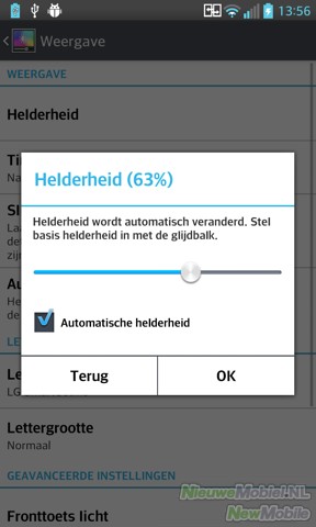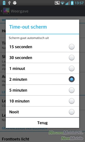LG heeft allerlei trucjes in dit toestel gestopt om het uithoudingsvermogen te vergoten. Niet alleen de krachtige batterij draagt hier aan bij. Natuurlijk kun je de helderheid en de time-out van het scherm aanpassen, maar er is ook nog een eco-modus toegevoegd waarmee de levensduur van de batterij wordt verlengd. Verder zorgt de interface ervoor dat het scherm tot zeventig procent minder energie gebruikt dan AMOLED-beeldschermen.