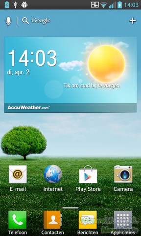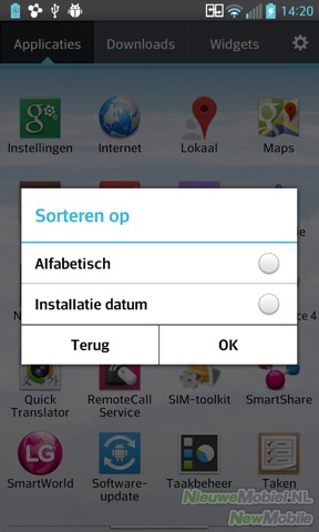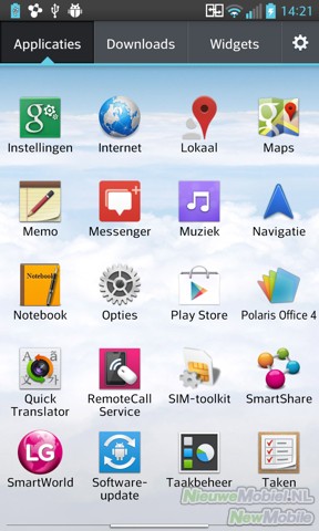 Je kunt de programma's sorteren op alfabetische volgorde of op installatiedatum, en de iconen kun je verkleinen, zodat er meer op één scherm passen. Naast de standaard apps als agenda, alarm/klok, calculator en degene die we al behandeld hebben, vindt je op de Optimus G nog de applicatiemanager en backup, bestandsbeheer, Cell Broadcast, Chrome, FM-radio, Maps, Messenger, muziek, Notebook (waarin je notities in een boekenkast worden weergegeven), Playstore, Polaris Office 4, Quick Translator, Remotecall Service, SmartWorld, taken, Video Wiz, Weer, woordenboek en YouTube.