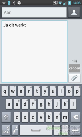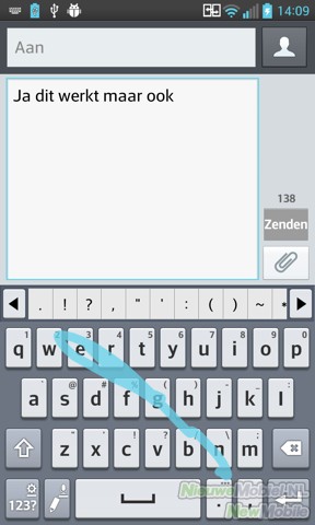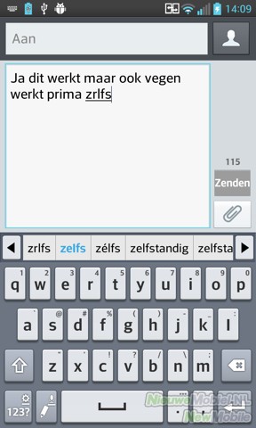 Er zijn natuurlijk heel veel toestellen waarmee je verschillende opties heb voor het invoeren van berichten, maar vaak zijn de alternatieve mogelijkheden een heel gedoe, wil je ze echt gebruiken. De Optimus G is hier een uitzondering op. Het ‘traditionele' intypen van berichten op het touchscreen gaat zo gemakkelijk als het maar kan, maar hier werkt ook het swypen van letter naar letter meer dan prima. Je hebt meteen te pakken, en het gaat echt sneller dan intypen. Dat geldt overigens niet meteen voor de derde optie: het schrijven van letters met je vinger, die het toestel dan herkent en invoert in het bericht. Als je een onduidelijke letter hebt geschreven, doet het toestel een suggestie.