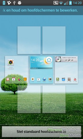 Zoals gebruikelijk bestaat het menu uit één homescreen met daaromheen nog zes andere schermen die je naar eigen inzicht in kunt vullen met widgets. Datzelfde geldt voor het lockscreen. Dit kan zowel via de opties als via de applicatietoets. In alle screens is er onderin nog plaats voor maximaal zes icoontjes van je meest gebruikte apps. Deze kun je zelf kiezen, en je kunt ook een icoontje toevoegen dat je zelf leuk vindt. Je kunt zelfs een zelfgemaakte foto kiezen als icoon.