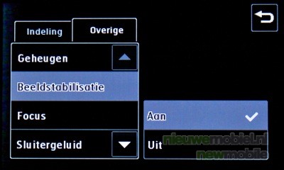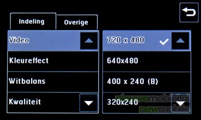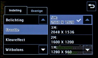 Geavanceerde instellingen van de camera: wijzigen van de belichting en grootte (5 megapixel: 2560 x 1920, 3 megapixel: 2048 x 1536, 2 megapixel: 1600 x 1200, 1 megapixel: 1280 x 960, 640 x 480 of 320 x 240 pixels), kleureffect (uit, zwartwit, negatief of sepia), witbalans (auto, lichtgevend, zonnig, fluorescerend of bewolkt, macro (close-up maken), zelfontspanner (kiezen uit 3, 5 of 10 sec.), ISOwaarde (Auto, ISO 100, 200, 400 of 800), Kwaliteit (superfijn, fijn en normaal), inwendige, externe camera (schakel voor zelfportretten over op de interne camera). De optie beeldstabilisatie zorgt ervoor dat een foto gemaakt wordt zonder trillingen van de camera. Wanneer de camera wordt afgesloten, krijgen alle instellingen weer hun standaardwaarde, behalve de grootte en kwaliteit van de afbeelding.