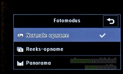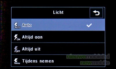 De flitser is standaard ingesteld op automatisch (auto) maar kan ook altijd aan -of altijd uitgeschakeld worden. Er zijn drie typen opnamen: een normale foto, een reeks-opname waarbij snel achter elkaar negen opnamen gemaakt worden of een panoramafoto, voor het maken van een foto van een grote groep mensen of van een landschap.