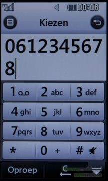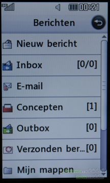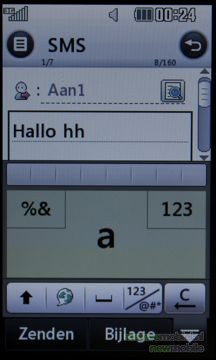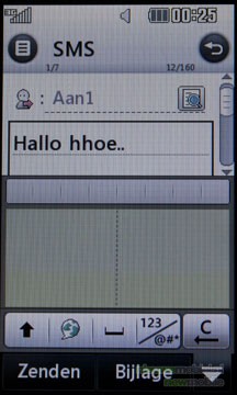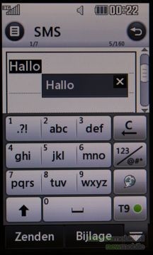 Het versturen van een bericht is opvallend simpel met deze telefoon maar kent daarnaast verrassend leuke mogelijkheden. Als in het hoofdscherm op het icoontje met een envelop gedrukt wordt, dan opent het menu berichten zich vanzelf. Meteen de eerste functie is het maken van ‘een nieuw bericht’. Klik daarop en kies uit het versturen van een bericht (SMS) of een email. Vervolgens opent zich een mooi groot scherm waar het bericht in getypt kan worden. Dit is het standaardscherm waarin het gebruikelijke toetsenbord van een telefoon zichtbaar is. Hierbij kan gebruik worden gemaakt van de T9 functie. Door op de knop T9 te drukken op het scherm, wordt deze functie in- of uitgeschakeld. Nieuwe woorden kunnen in een mum van tijd worden opgeslagen in het woordenboek.